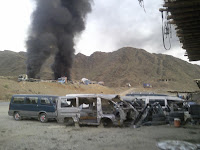 Haji Ahmad, a shopkeeper in Afghanistan side of the Torkham who witnessed the incident , told this scribe that dozens loaded trucks and containers were waiting for document clearence to enter Pakistan in the private parking lots inside Afghanistan.He said several explosions took place within the few minutes around 5 am, followed by gun fires. An official pleading anonymity said the militants had first beheaded all the seven ANA soldiers at the picket constructed near the US army Sheraz camp. "As blasts occured in the loaded trucks parked in the parking lots followed by small gun and rocket launcher fires", he said.He said that militants had come to the parking lots in the darkness and hand cuffed the parking lots' watchmen.The gunmen had attached explosives devices with the each truck which were triggered with explosions around 5 am,sources added. At least forty trucks in the parking lots and the equipments and armoured vehicles over it caught fire after the explosions and reduced to ashes. The parking lots are located some five hundreds yards from the US base camp where trucks stay for few days to get documents clearence and enter Pakistan. Quoting Afghan officials, the sources said that the main aim of the militants was to enter the US army base camp after the explosions and carry out suicide bombings inside the army camp.A colonel of US forces and an auto mechanic,Naeem were also injured in the attack. As the blasts took placed Afghan National Army and US field forces reached the spot backed by gunship helicopters and jet fighters,Afghan officials said,adding after seven hours resistance five gunmen were shot dead while two others were arrested alive. independent sources said that first explosion was of the suicide attack when bomber strucked himself with the main US base camp and several other militants entered to Sheraz US base camp.However, Afghan officials claimed to have killed five bombers in the combat before they enter into the camp while two were arrested alive. He said Afghan National Army and US soldier were remain safe in the attack. Afghan security forces had cordond off the whole Torkham bazaar and blocked Torkham-Jalalabad highway for seven hours to avoid human casualty. Later passengers and trucks were allowed to cross the border.
